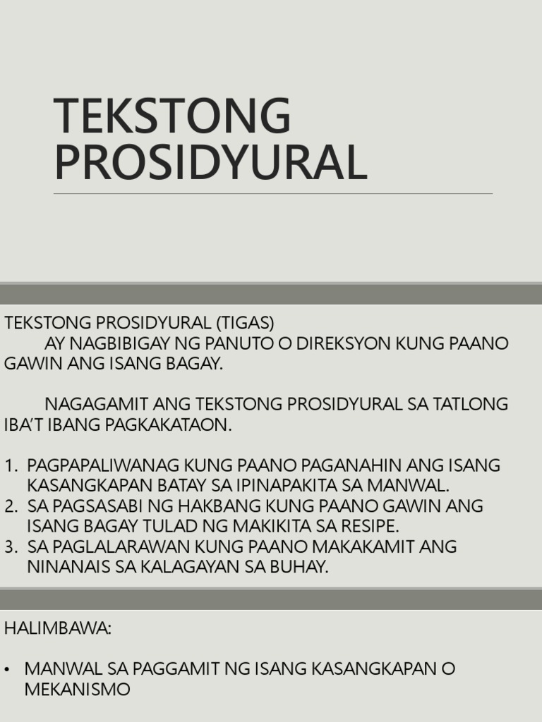 Ang tekstong prosidyural ay isang uri ng teksto na naglalaman ng mga paraan ng paggawa sa isang bagay. Mga Halimbawa Ng Tekstong Impormatibo. March 11 2017 jaeannetabile Sa lahat ng ginagawa natin sa pang araw araw ay parang isang lutong ulam ihahanda mo ang mga rekado mga kagamitang na gagamitin mga proseso o mga hakbang upang matapos mo ang isang producto.