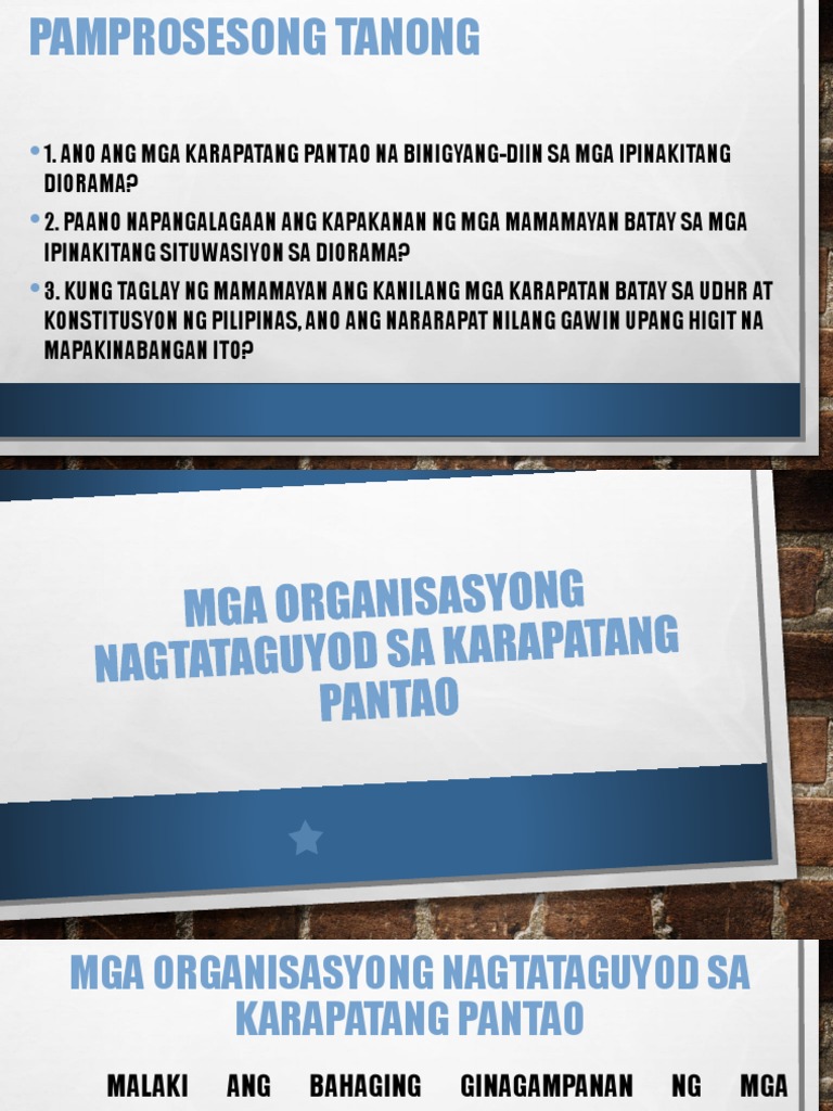 MGA ORGANISASYONG NAGTATAGUYOD NG KARAPATANG PANTAO 1. Araling panlipuna 10 cheymagano Follow Mga organisasyong nagtataguyod sa karapatang pantao 1. Dec 02 2020 Sa ika-30 ng Nobyembre ang araw ng paggunita sa kapanganakan ni Andres Bonifacio ilang sektor at organisasyon ang nagsagawa ng protesta sa Timog Katagalugan.