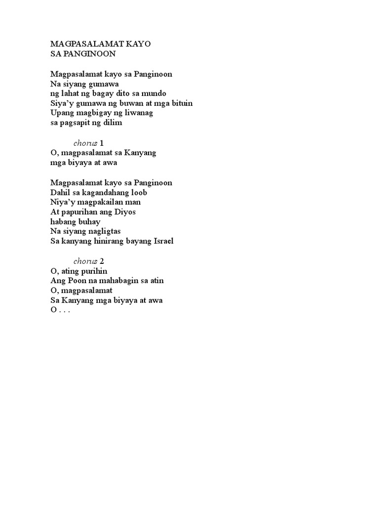 Catholic Songbook is an online songbook. MAGPASALAMAT KAYO SA PANGINOON Bm Em Magpasalamat kayo sa Panginoon A7 D F Na Syang lumikha ng lahat ng bagay dito sa mundo Bm Em Siyay gumawa ng buwan at mga bituin A7 D F Upang magbigay ng liwanag sa pagsapit ng dilim Refrain. Na Syang lumikha ng lahat ng bagay dito sa mundo.
