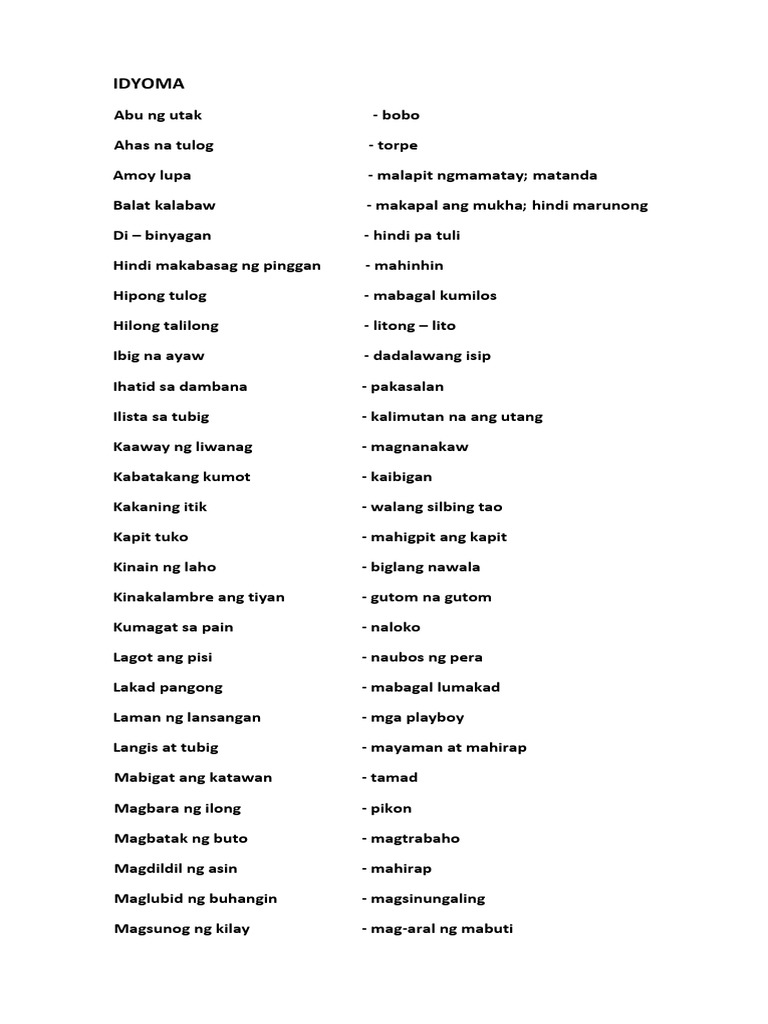 27062019 Narito ang ilan sa mga halimbawa ng idyoma at mga kahulugan ng bawat isa. Agua Bendita banal na tubig holy water Aleman taga-Germany.
